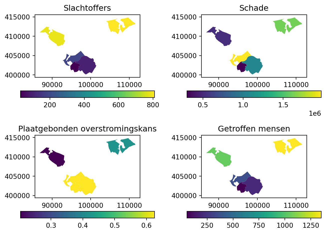 Met behulp van de CalculateFloodRisk module worden risico’s berekend voor 4 verschillende risicomate: (1) verwachte economische schade, (2) verwacht aantal slachtoffers, (3) verwacht aantal getroffenen, en (4) plaatsgebonden overstromingskans.