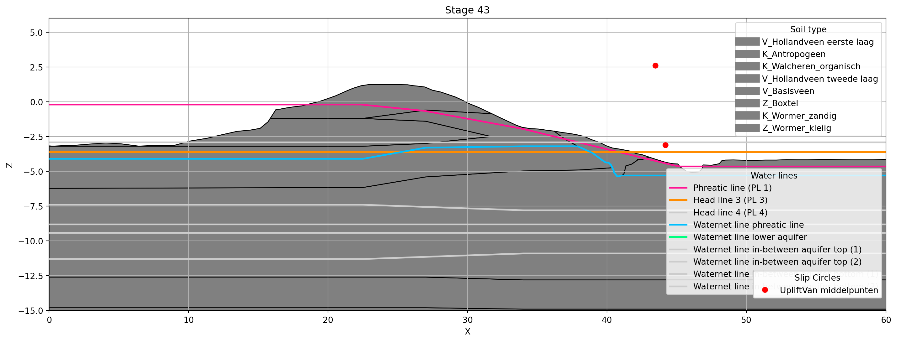 Op basis van een opgegeven stage ID en de gekoppelde tabellen, kunnen de dijkopbouw, waterlijnen en resulterende glijcirkels vervolgens geplot worden
